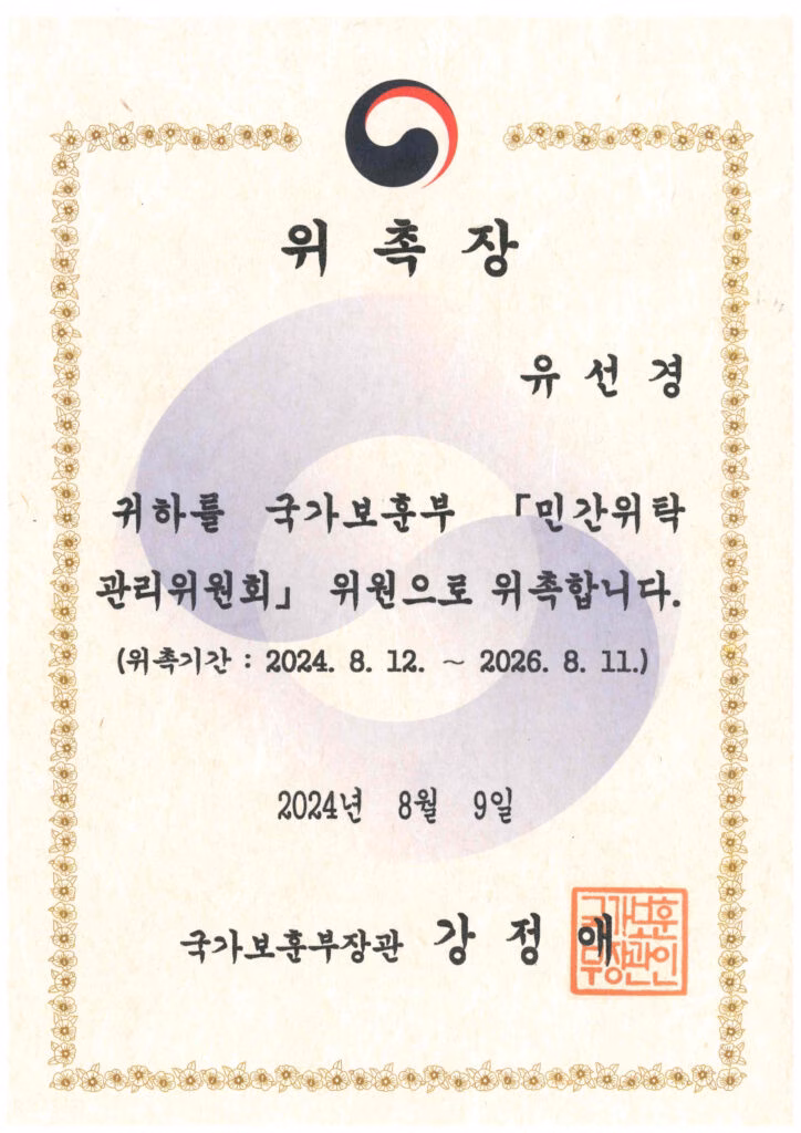 유선경 변호사는 2024년 8월9일 국가보훈장관(장관 강정애) 「민간위탁관리위원회」로 위촉되었습니다.